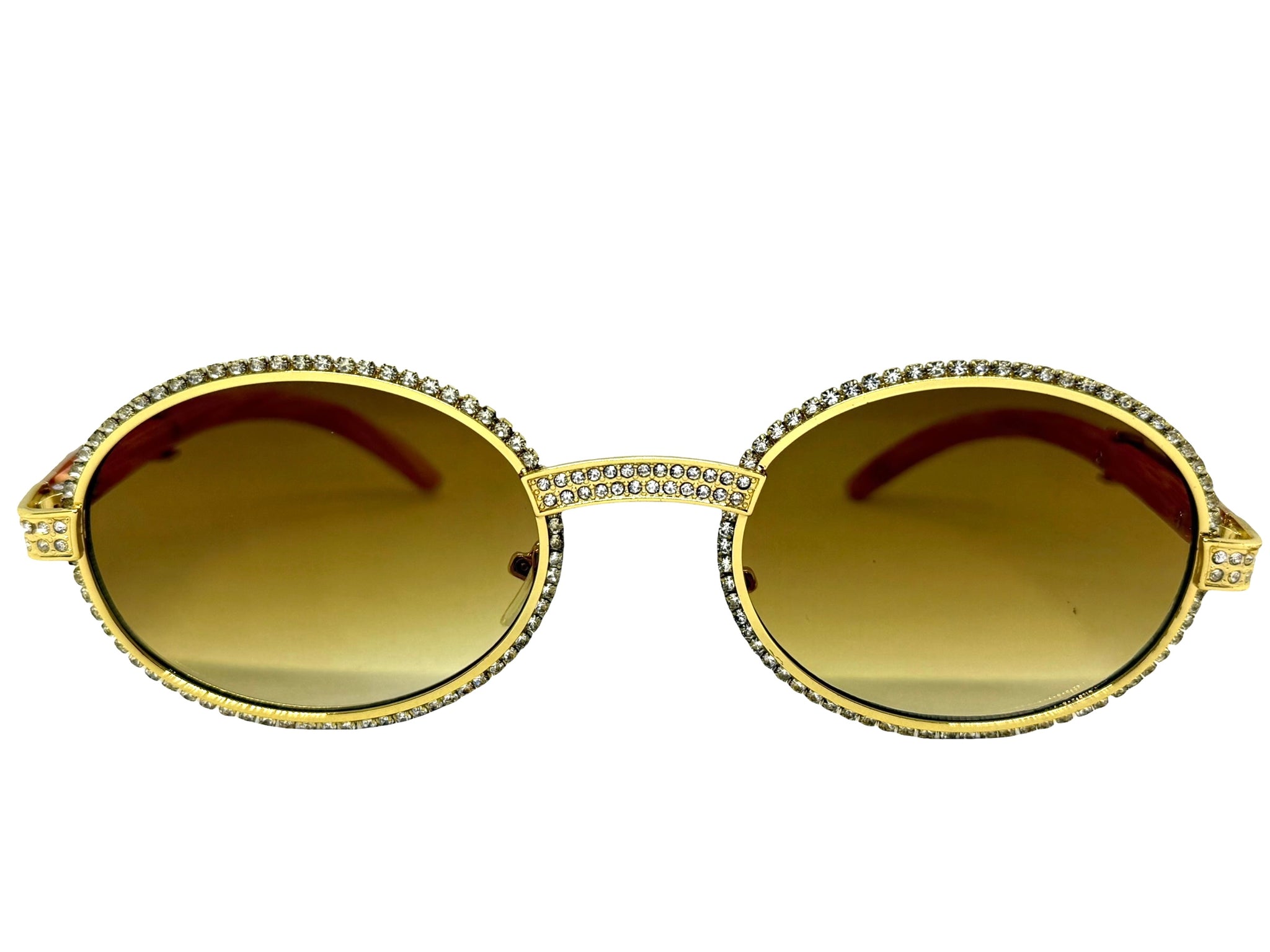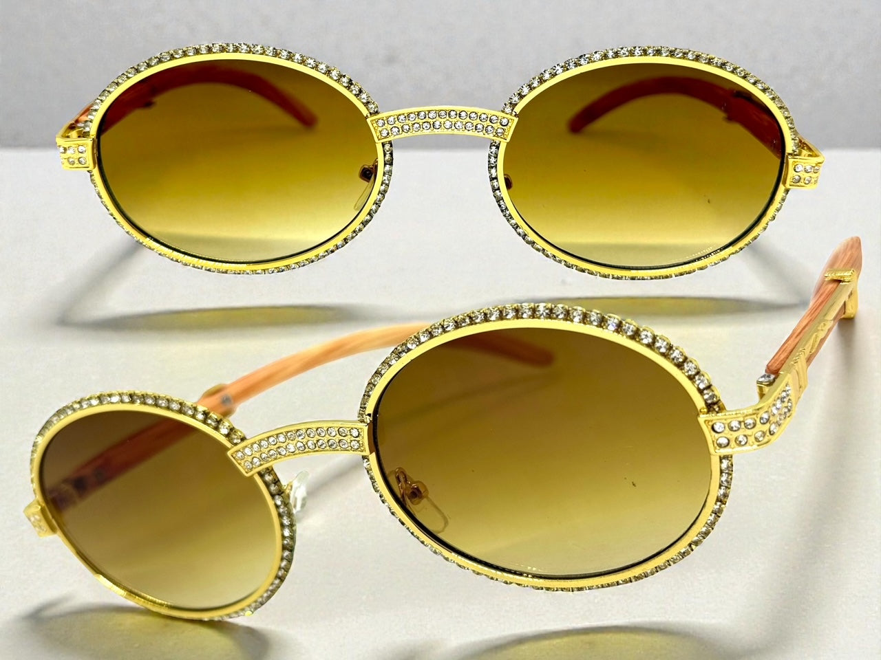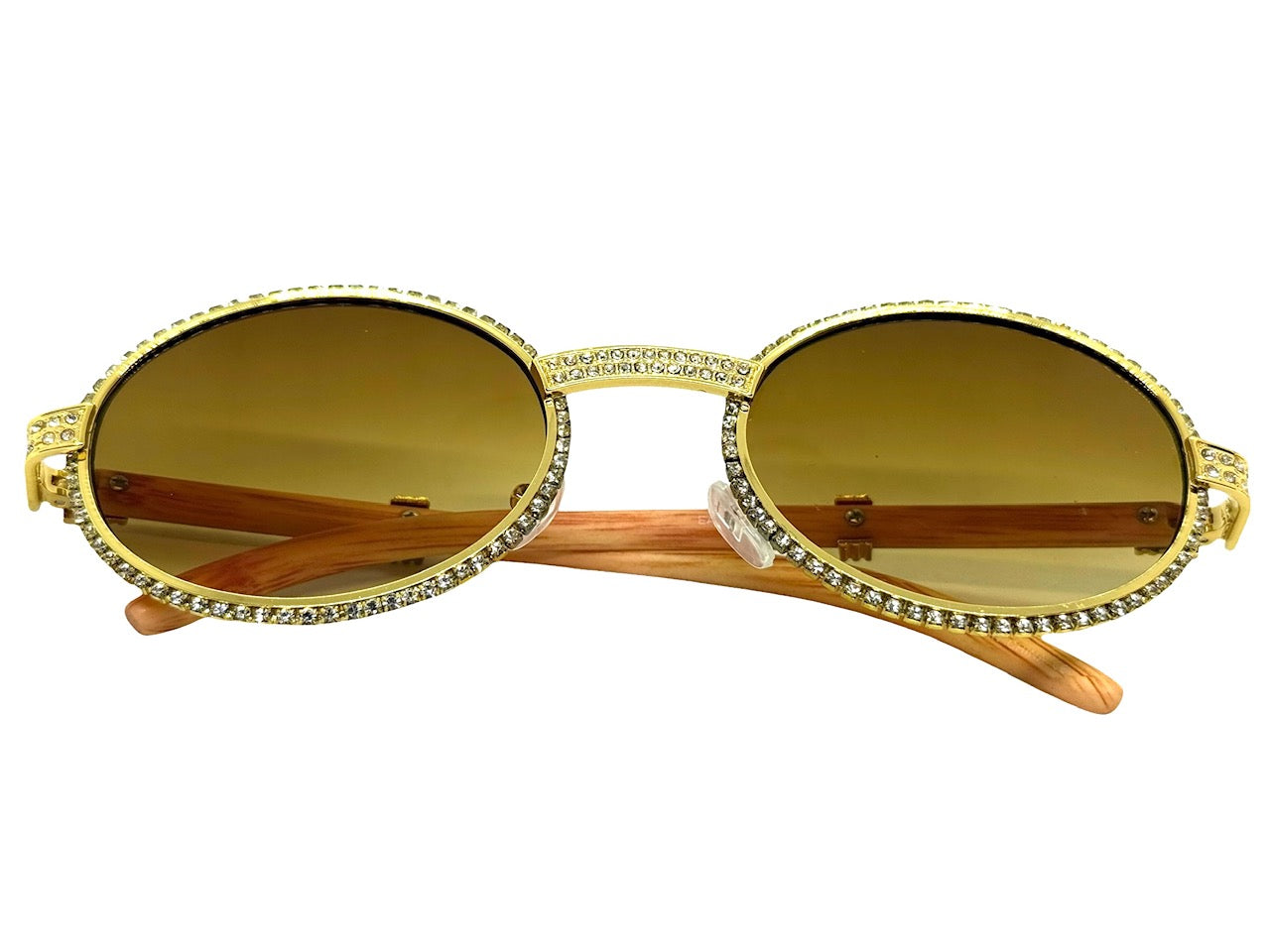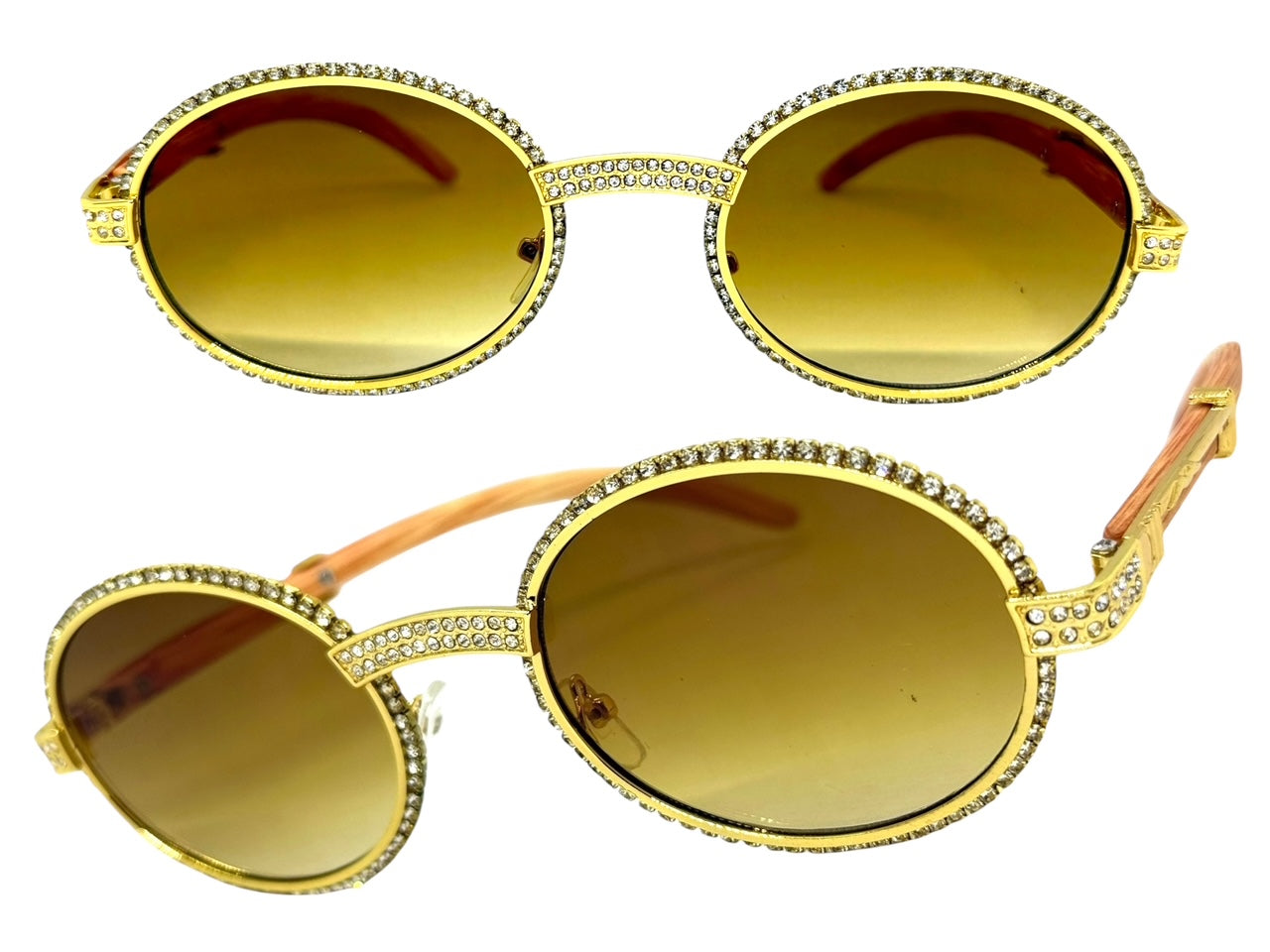 Classy Elegant Luxury Modern Hip Hop Style Bling SUNGLASSES Large Oval Gold & Faux Wooden Frame E0651