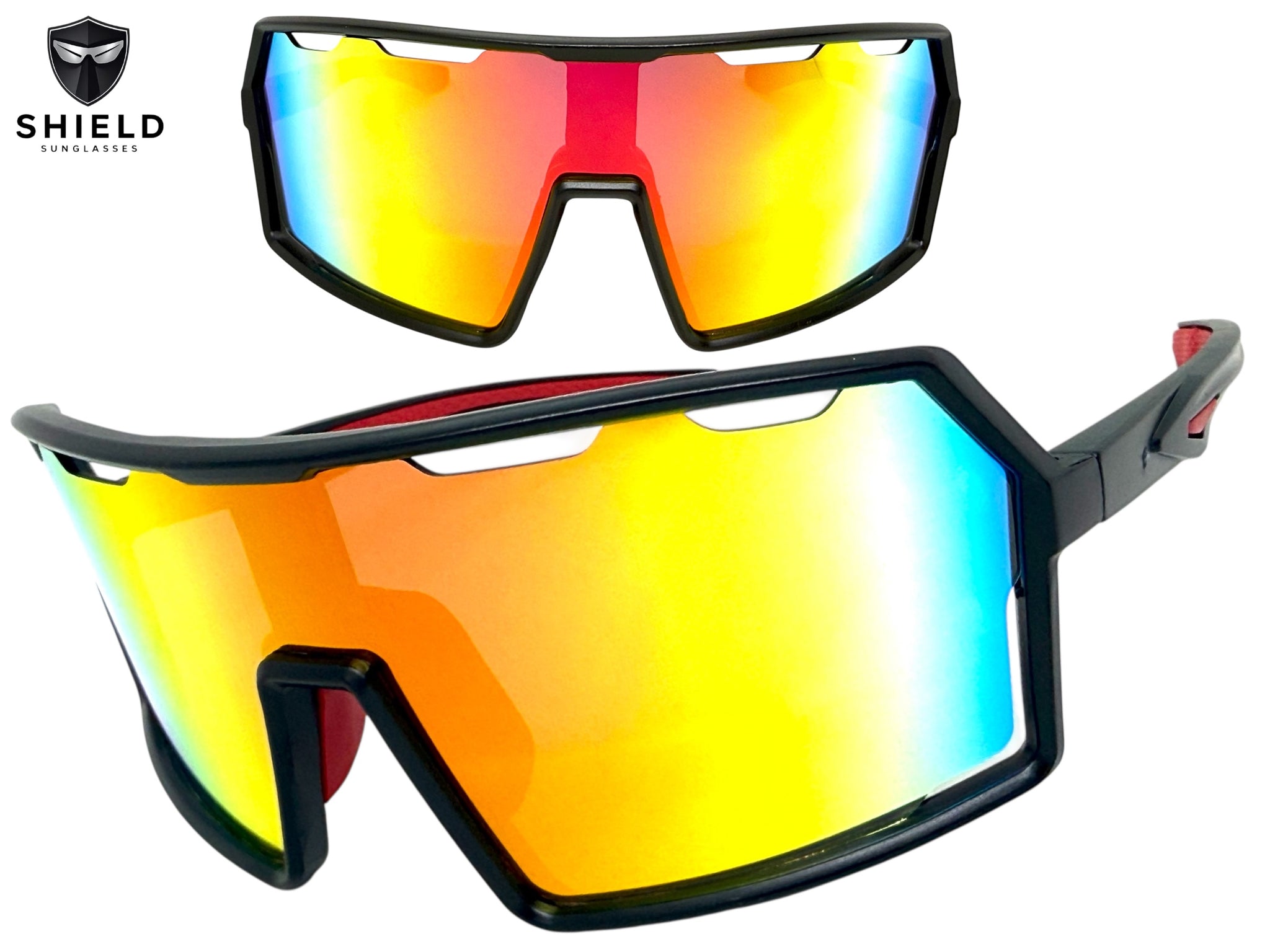 Oversized Retro Sporty Wrap Around Shield Style SUNGLASSES Large Black Frame - Gold Lens 5314