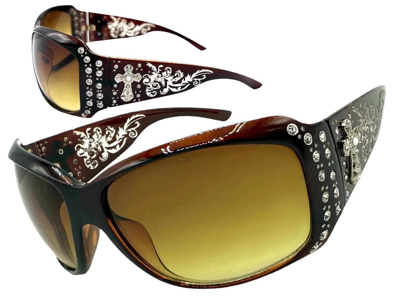 Oversized Classy Elegant Western Cowgirl Style SUNGLASSES Brown Frame with Silver Cross 8368