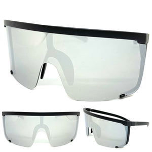 Oversized Modern Retro Shield Style SUNGLASSES Huge Black Frame Silver Lens 6331