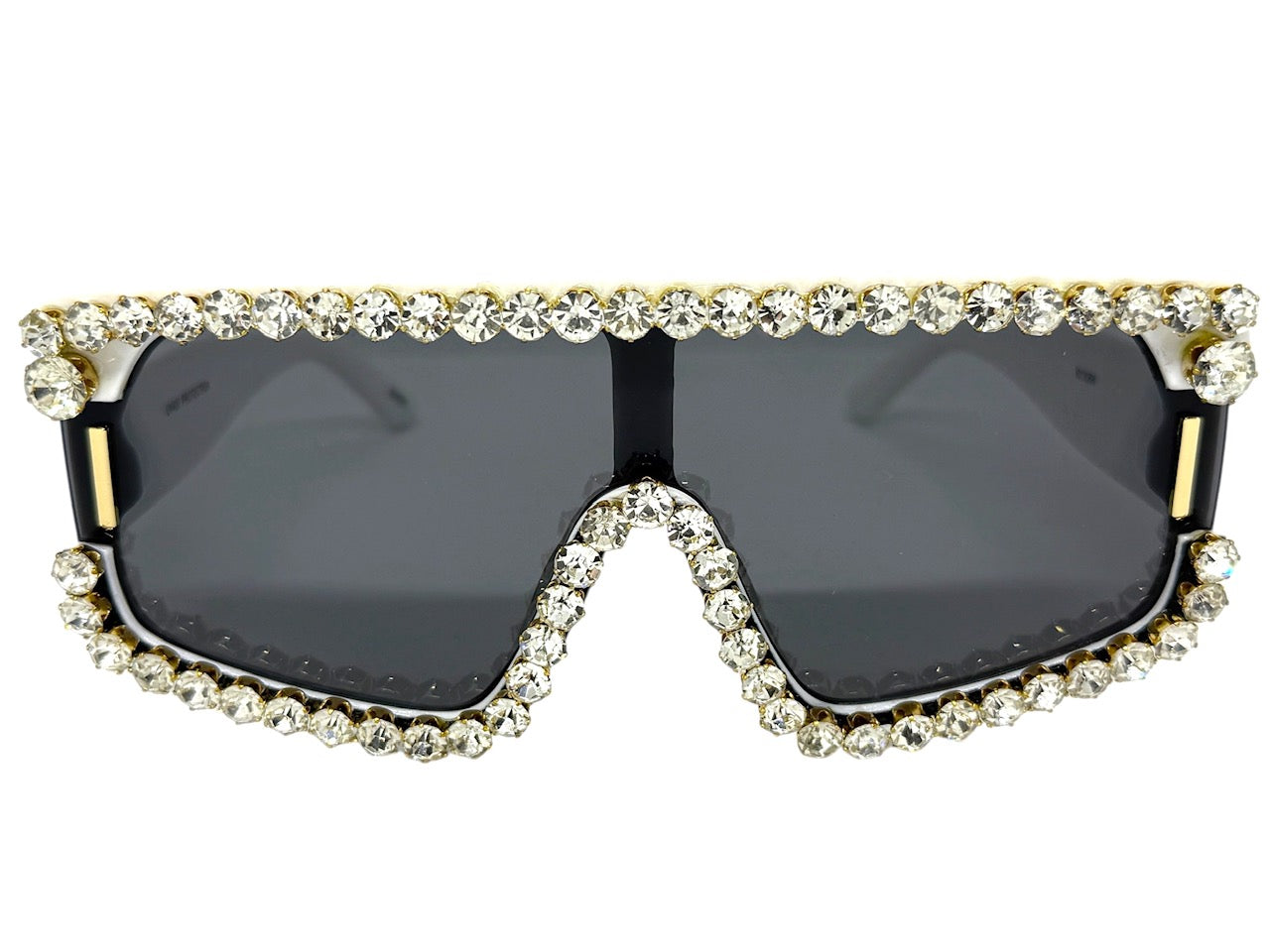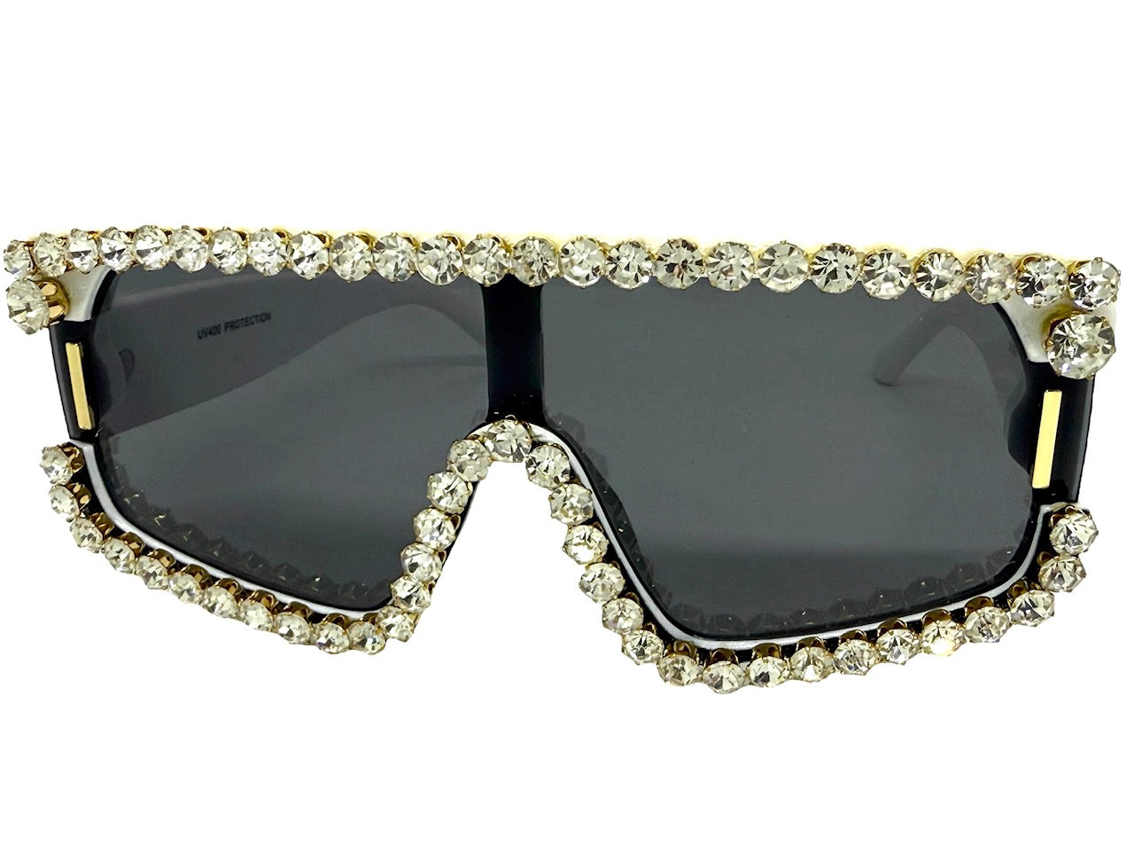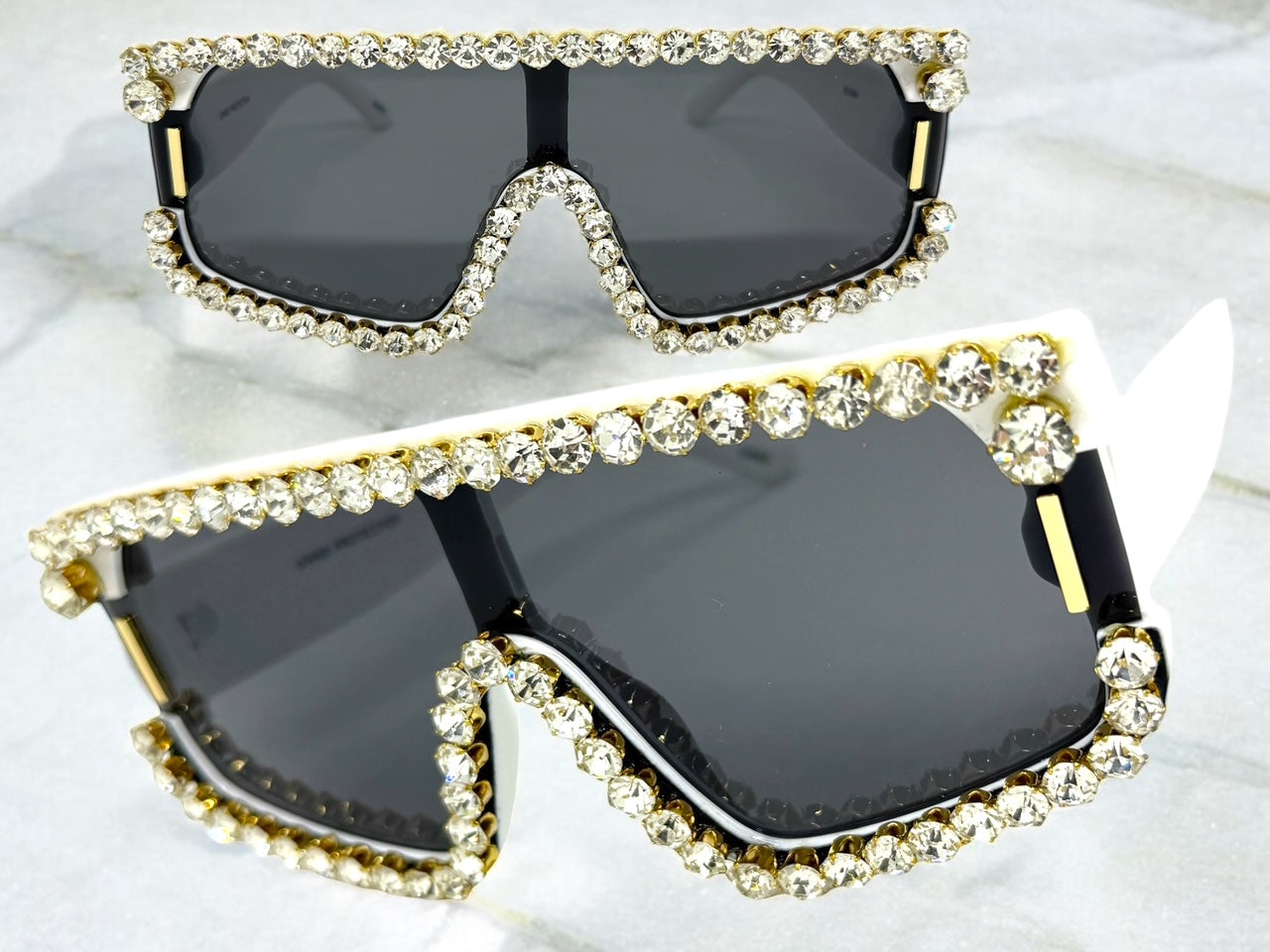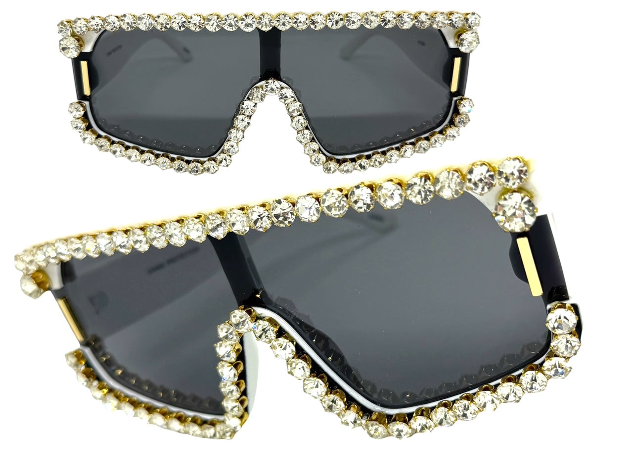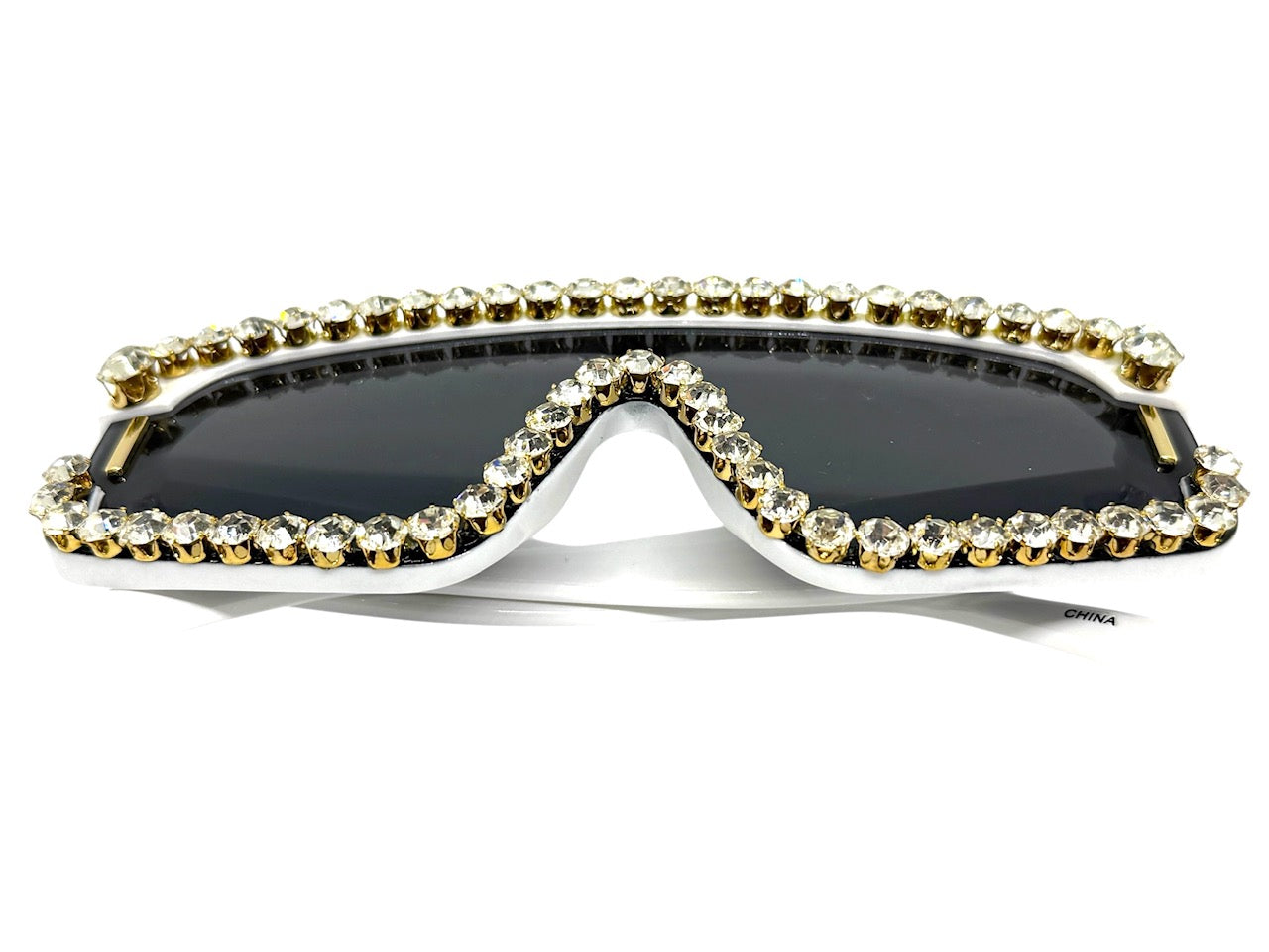 Oversized Exaggerated Retro Shield Style Bling Sunglasses Large White Frame with Sparkling Rhinestones 80130