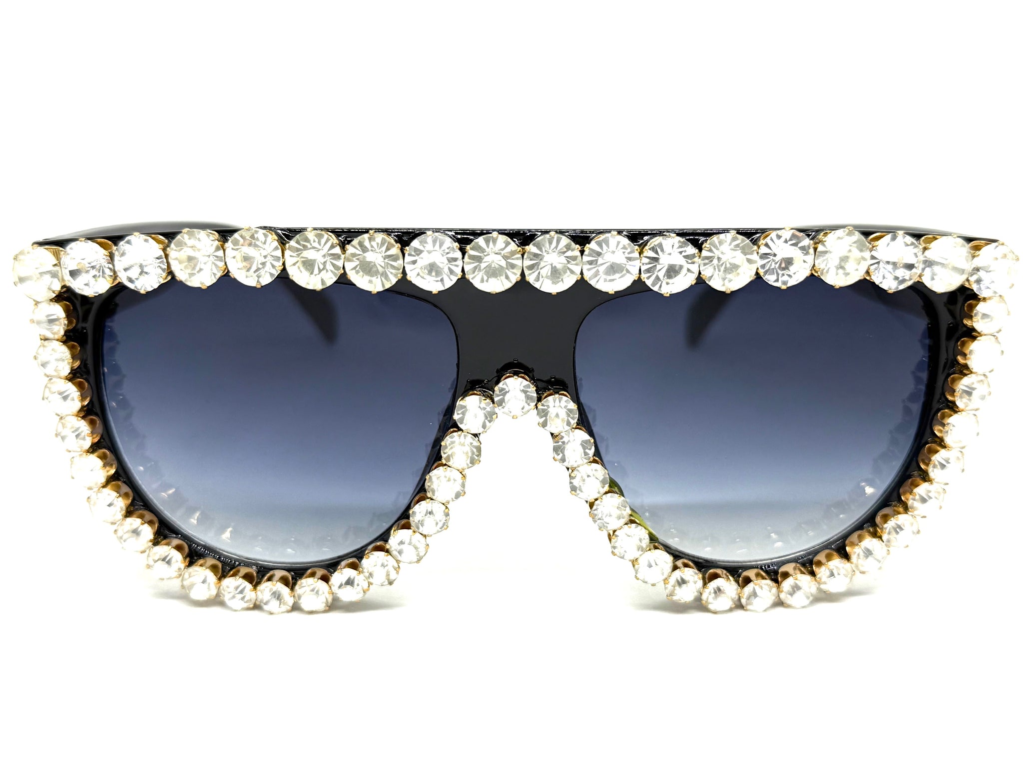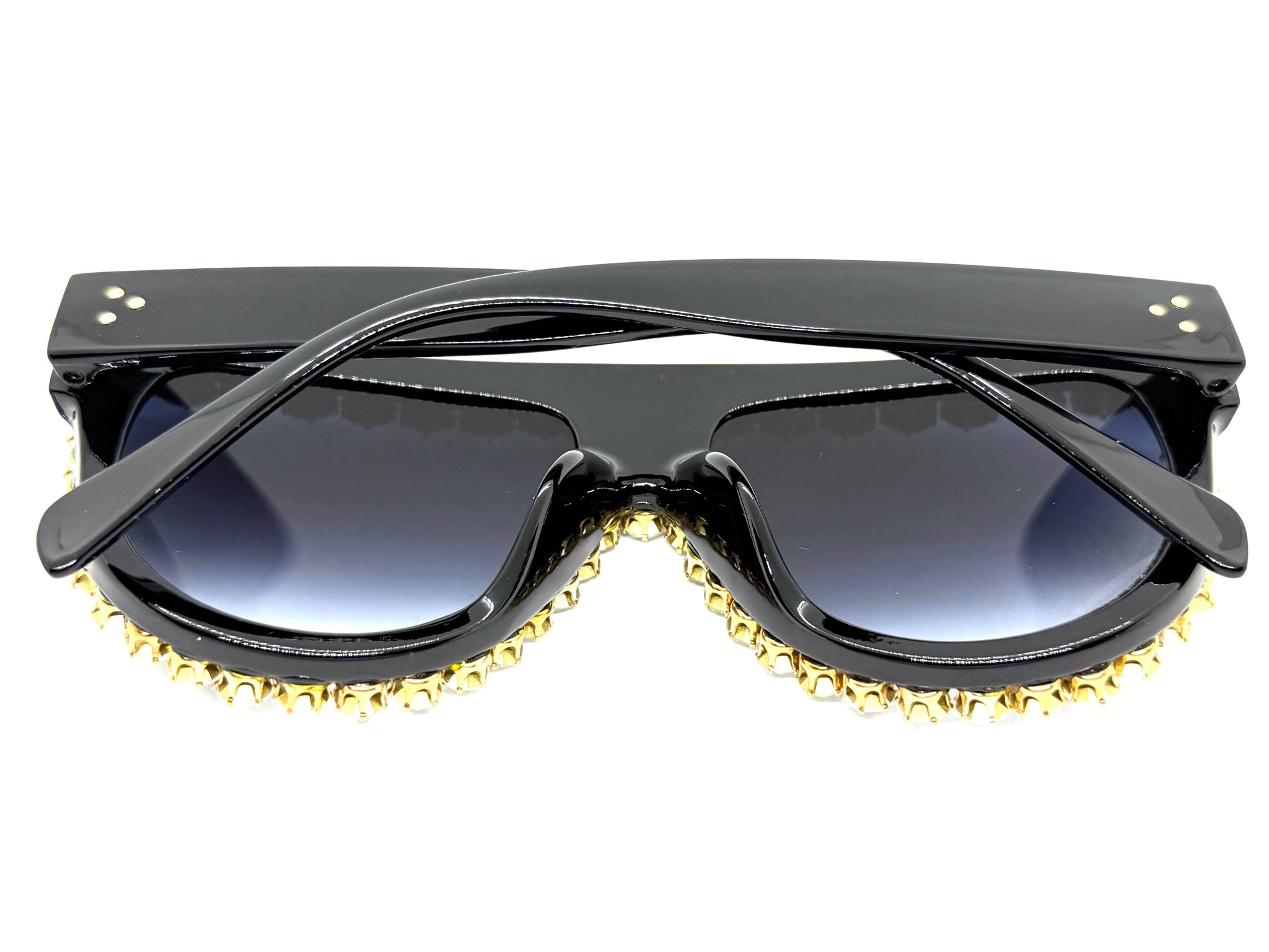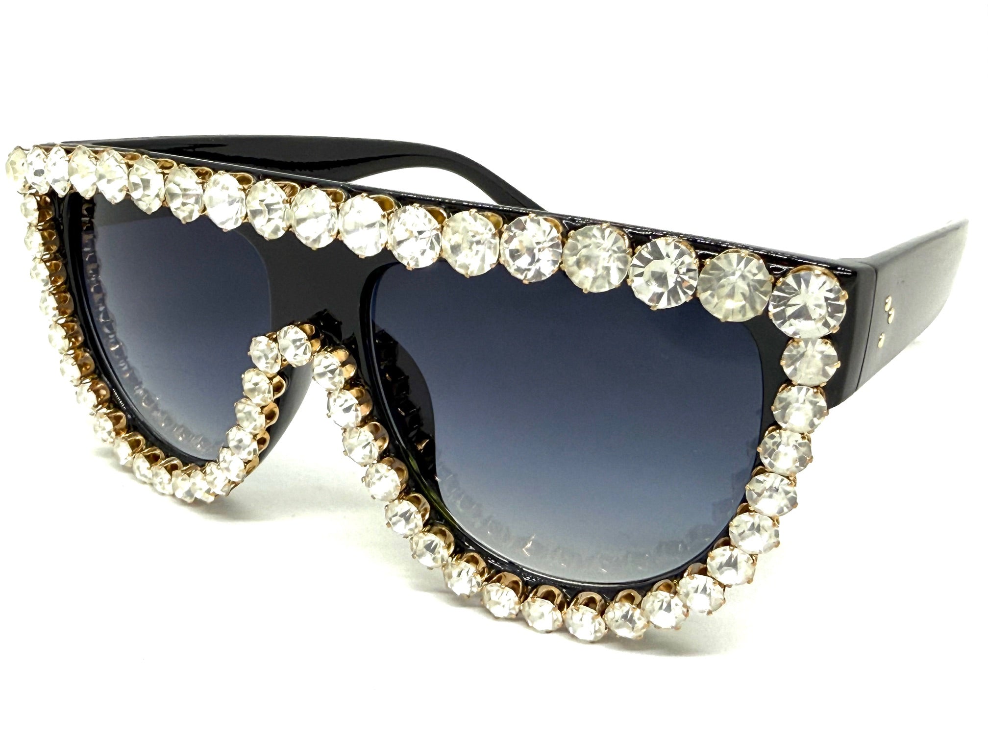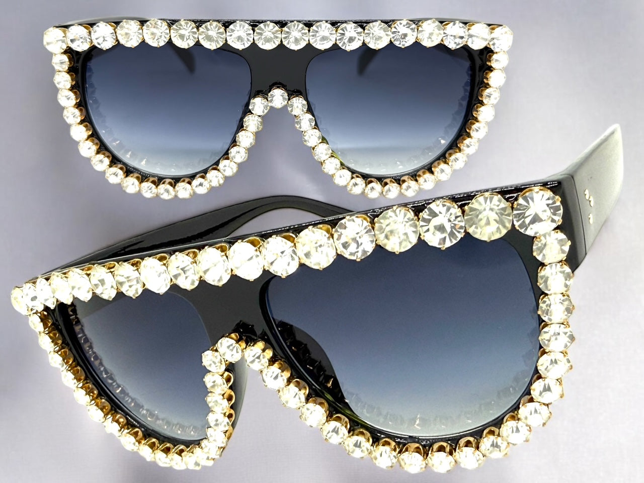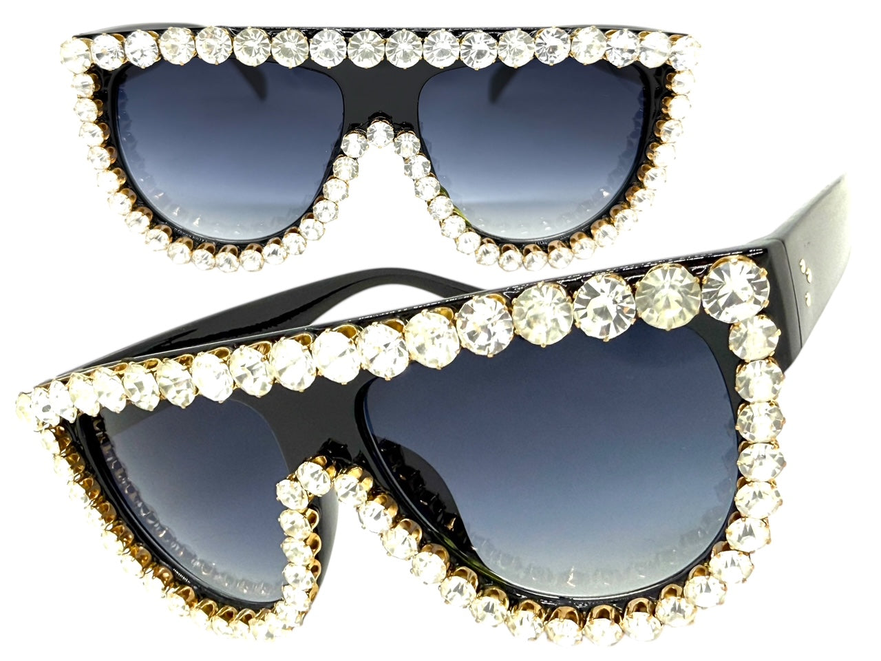 Oversized Exaggerated Retro Shield Style Bling Sunglasses Large Black Frame with Sparkling Rhinestones 6618