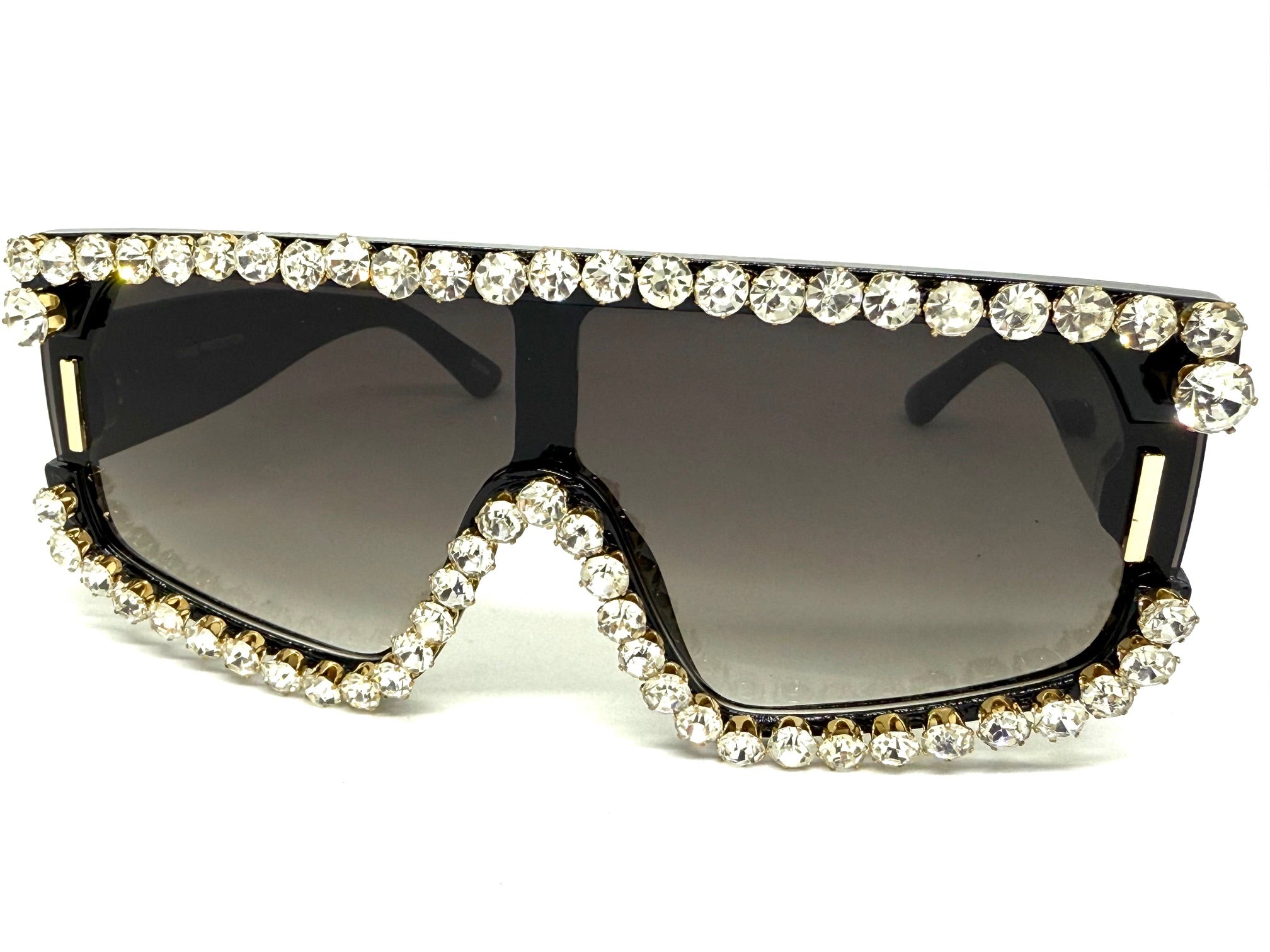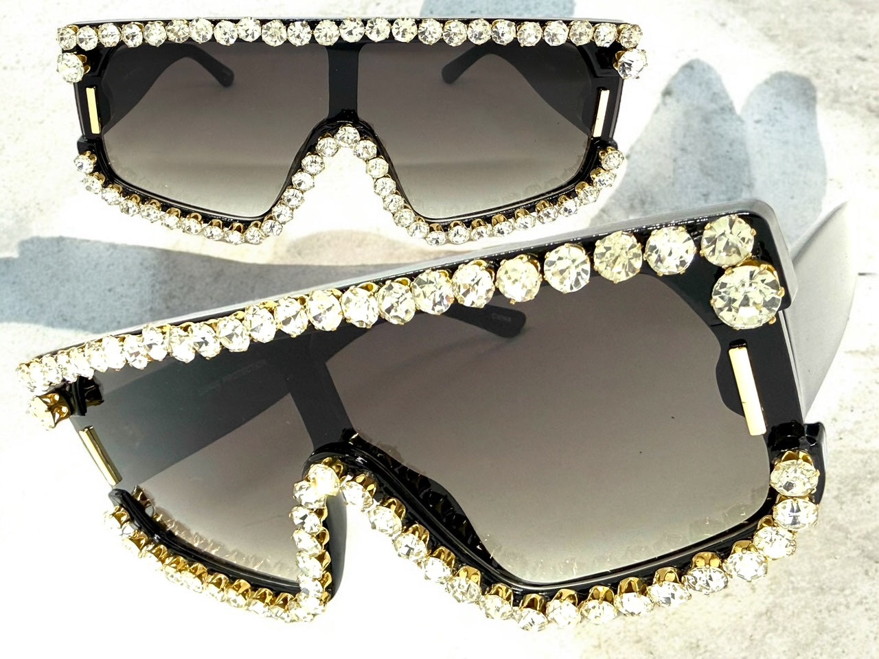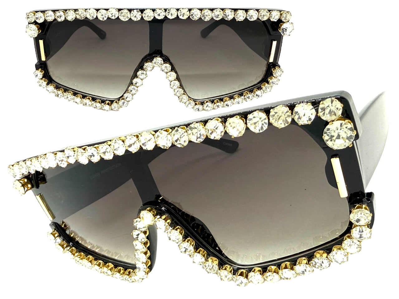Oversized Exaggerated Retro Shield Style Bling Sunglasses Large Black Frame with Sparkling Rhinestones 80130