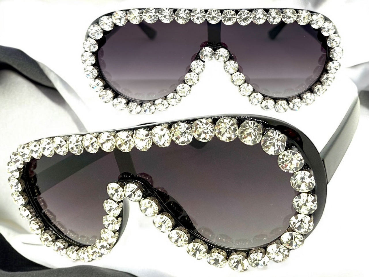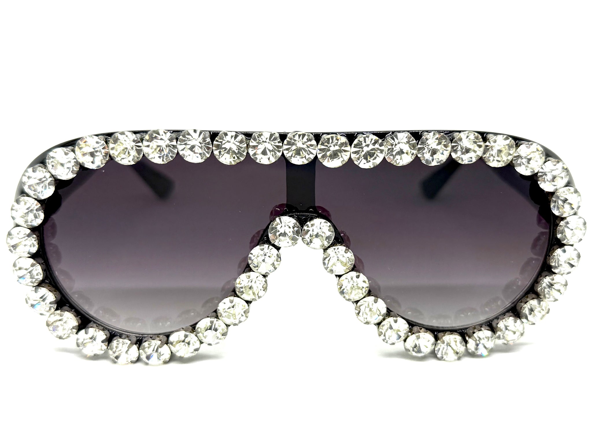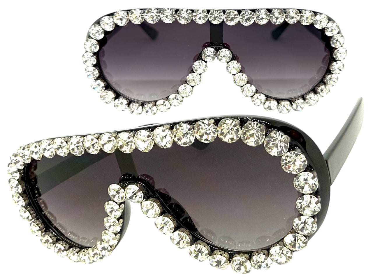 Oversized Exaggerated Retro Shield Style Bling Sunglasses Large Black Frame with Sparkling Rhinestones 80187